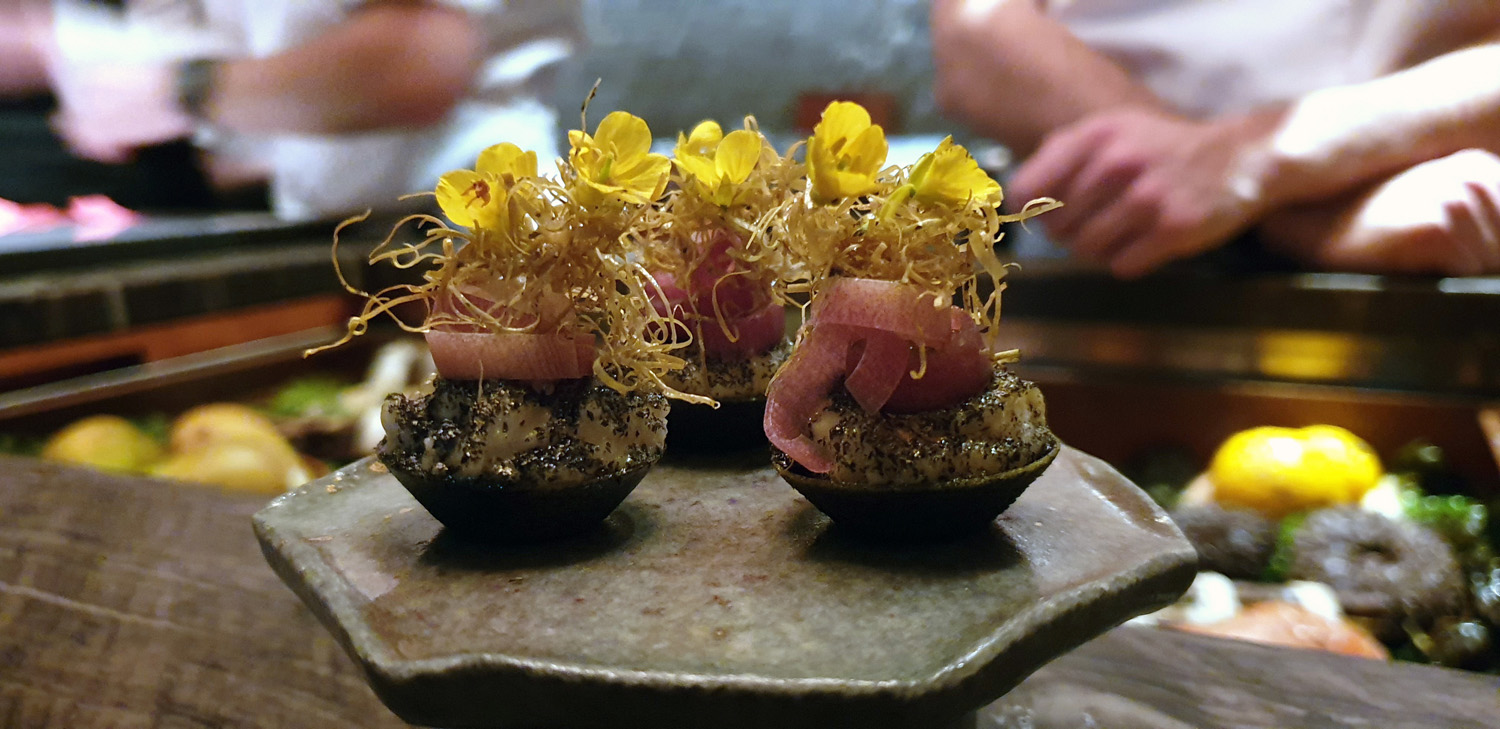 Up into the restaurant and dinner begins with Crudo – Aged Hiramasa , Fermented Plum , Shiso , Green Almonds and Coriander Blossom.