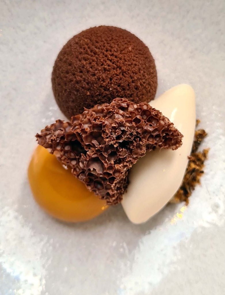 Chocolate Aero , Yeast parfait , toasted rice sorbet and Malt custard