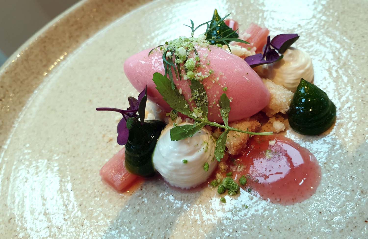 Rhubarb , Nasturtium oil jam , shortbread crumble and sour cream.