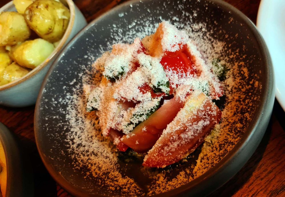 Plum Tomatoes , Pistachio Pesto and Goats Cheese £6.00