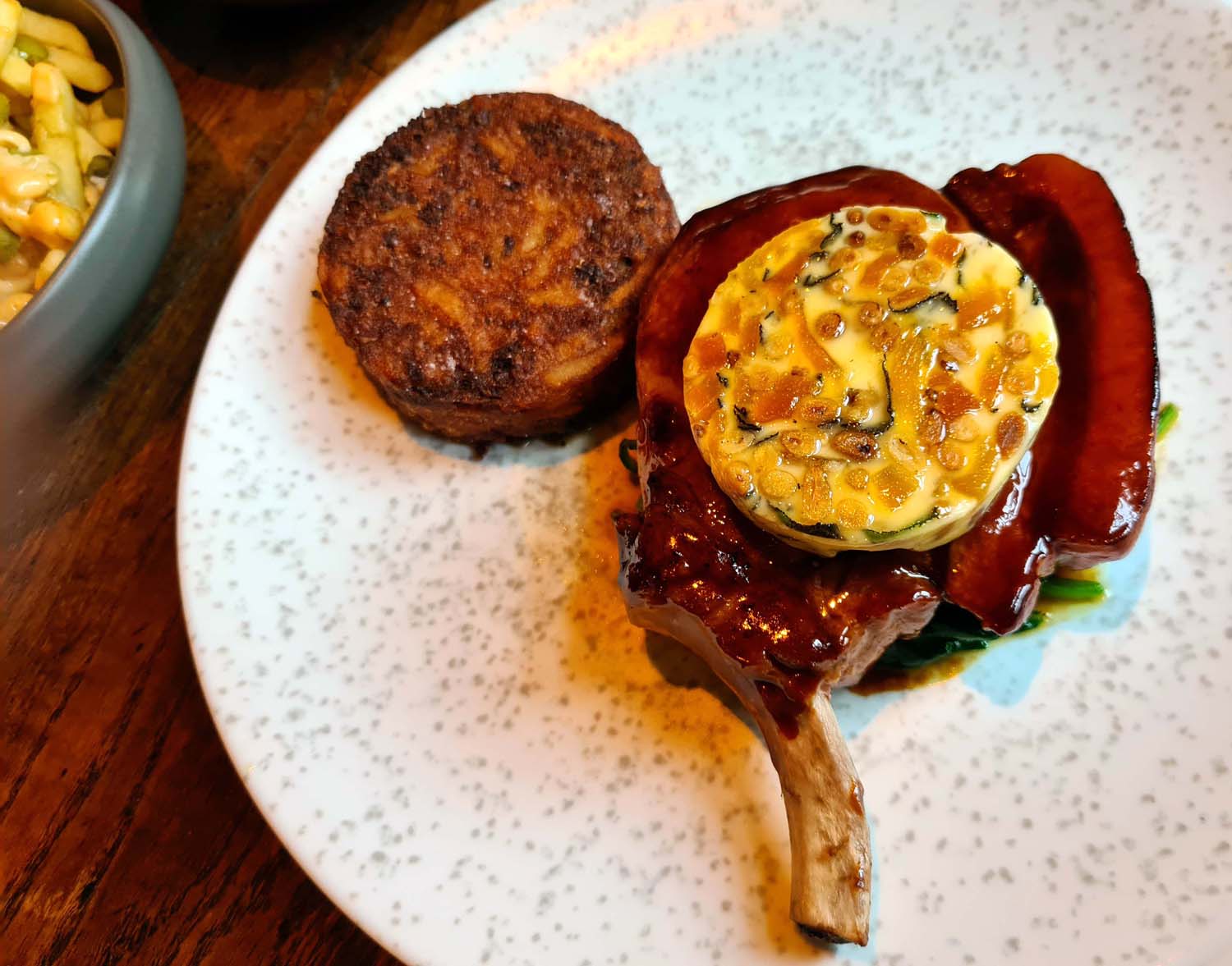 Pork Chop , Apricot , Pine nut & Sage Butter with Black Pudding Hash brown £21.00