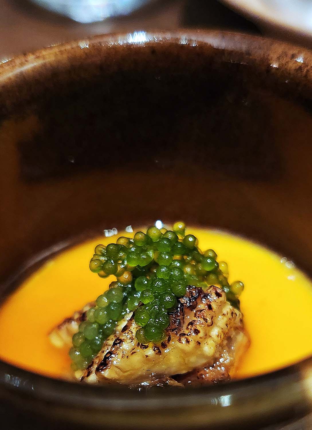 Sweet Jean Sweetcorn Custard , Clams and sea grapes , roasted Chicken bones and fats.
