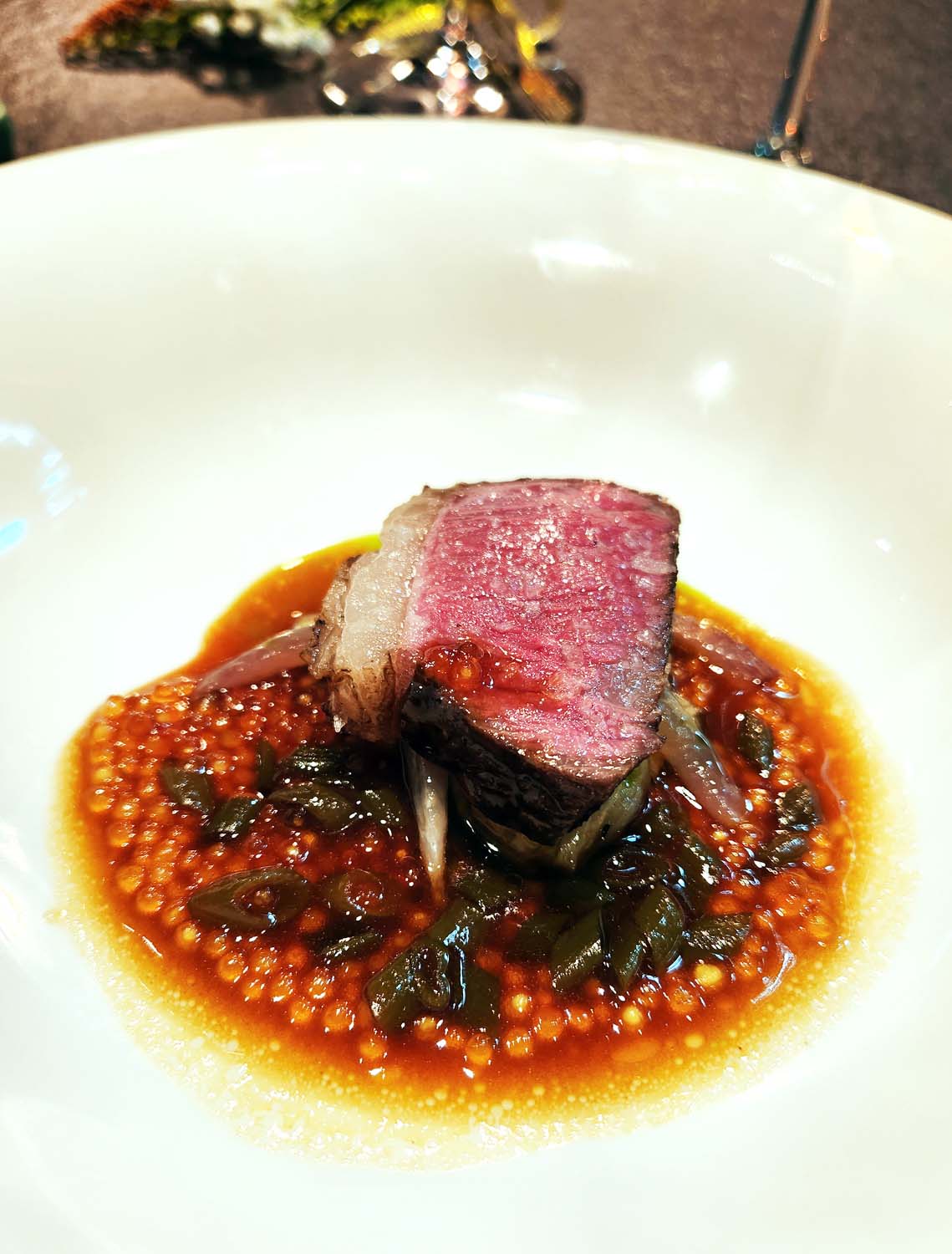 24 days aged Chiang Mai Wagyu striploin , Charred Aubergine , Anchovy and Mulberry Vinegar.