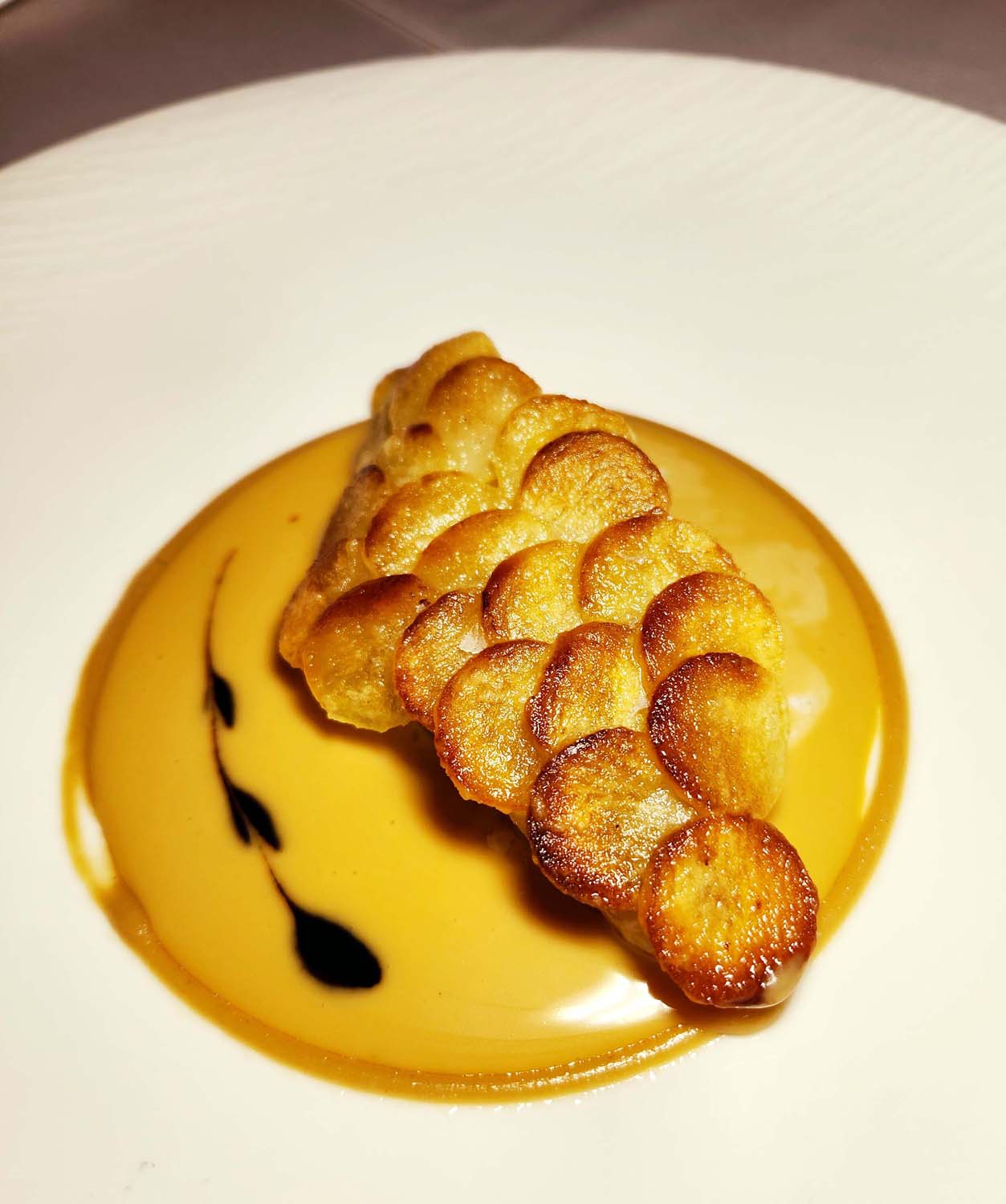 Hodgson`s Cod – Cured & steamed & Duck fat wrapped poached loin of Cod & White Crab meat. Wrapped in Pumpkin, Enoki Mushroom Ragout and a smoked Butter emulsion.