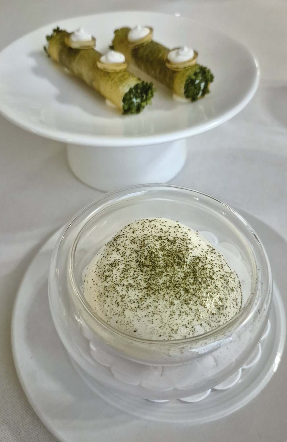 Nibbles at the table – Cauliflower Tart – Pickled Cauliflower florets , toasted Peanut & Coriander leaf tartare , cauliflower and coconut foam.