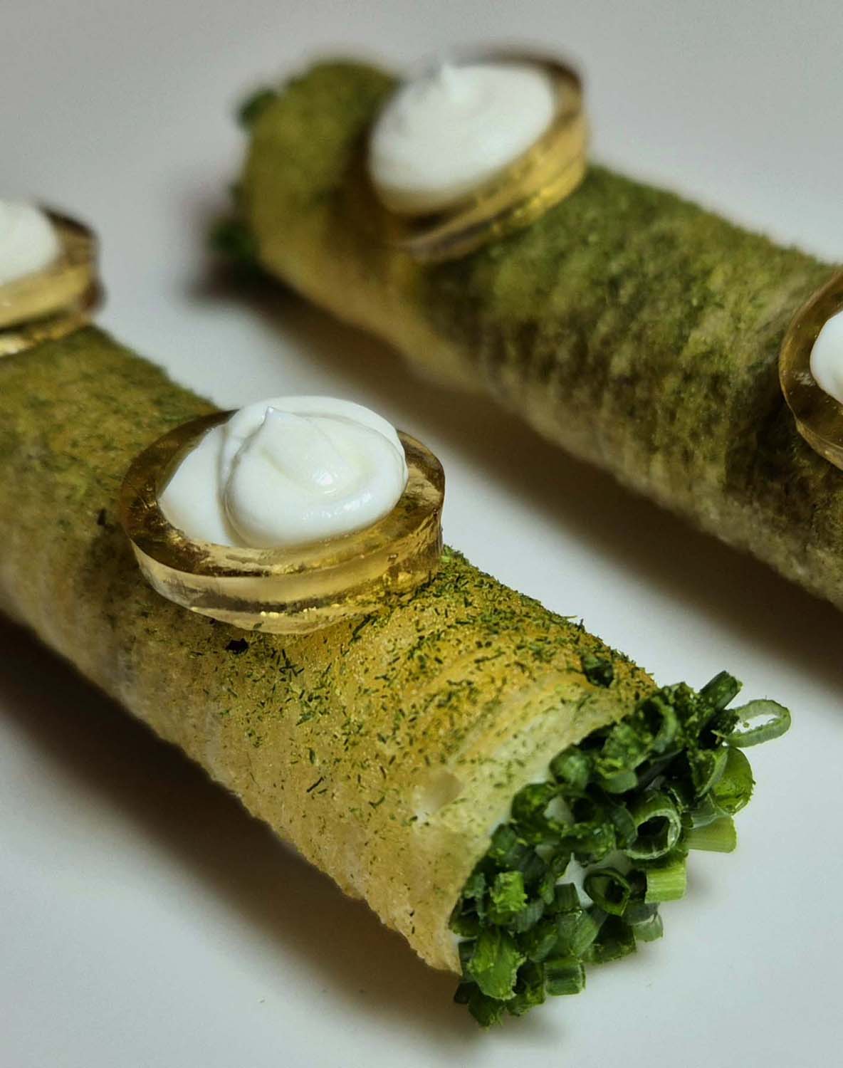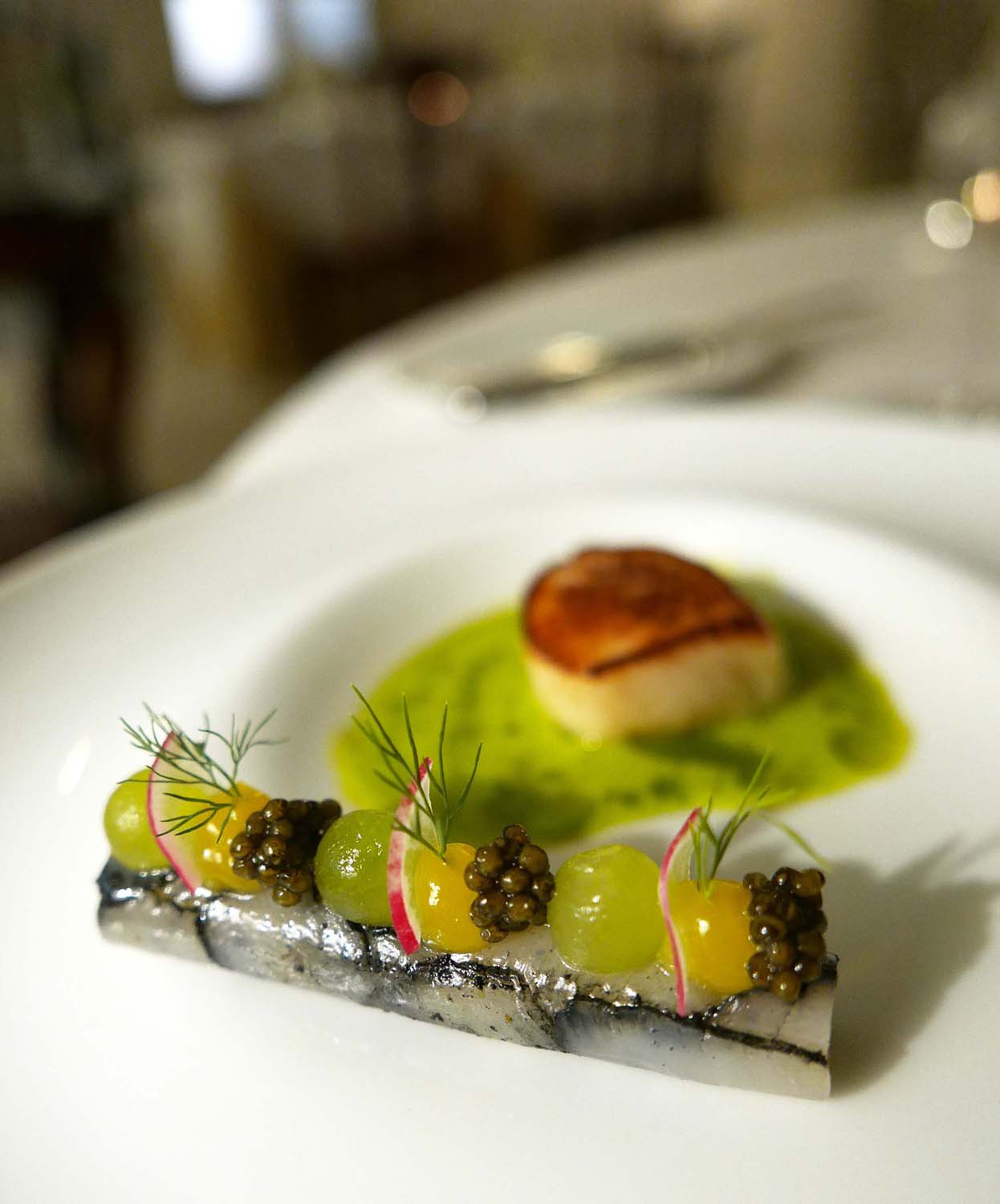 Scottish Scallops – Scallop Canellonni , roasted Scallop , Kalamansi gel , Kings Oscietra Caviar , Cucumber sauce.