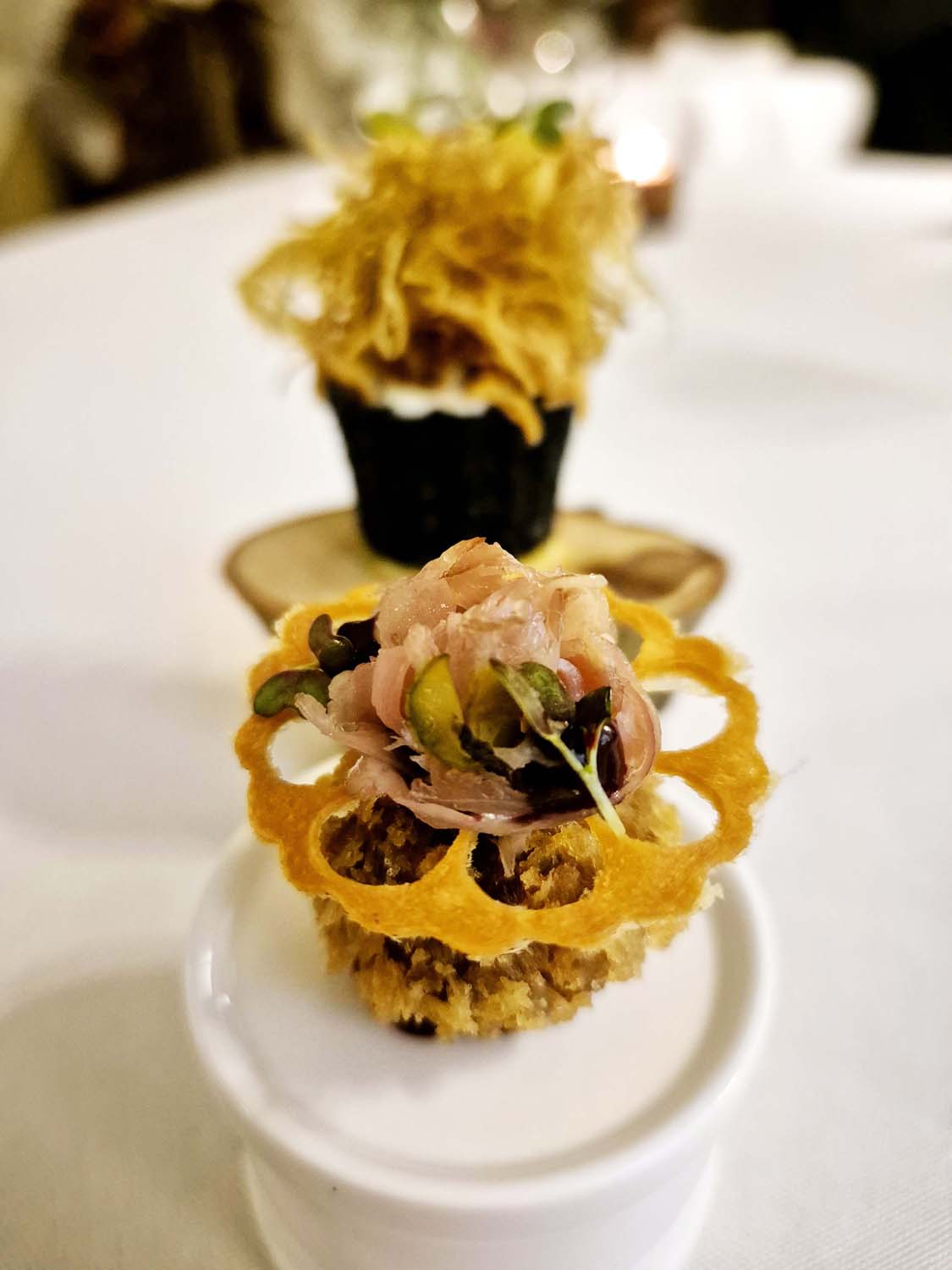 Nibbles at the table – Susan Aglionby`s Beef – Croustade of Beef Tartare , garden smoked Potato , crispy Enoki mushrooms.