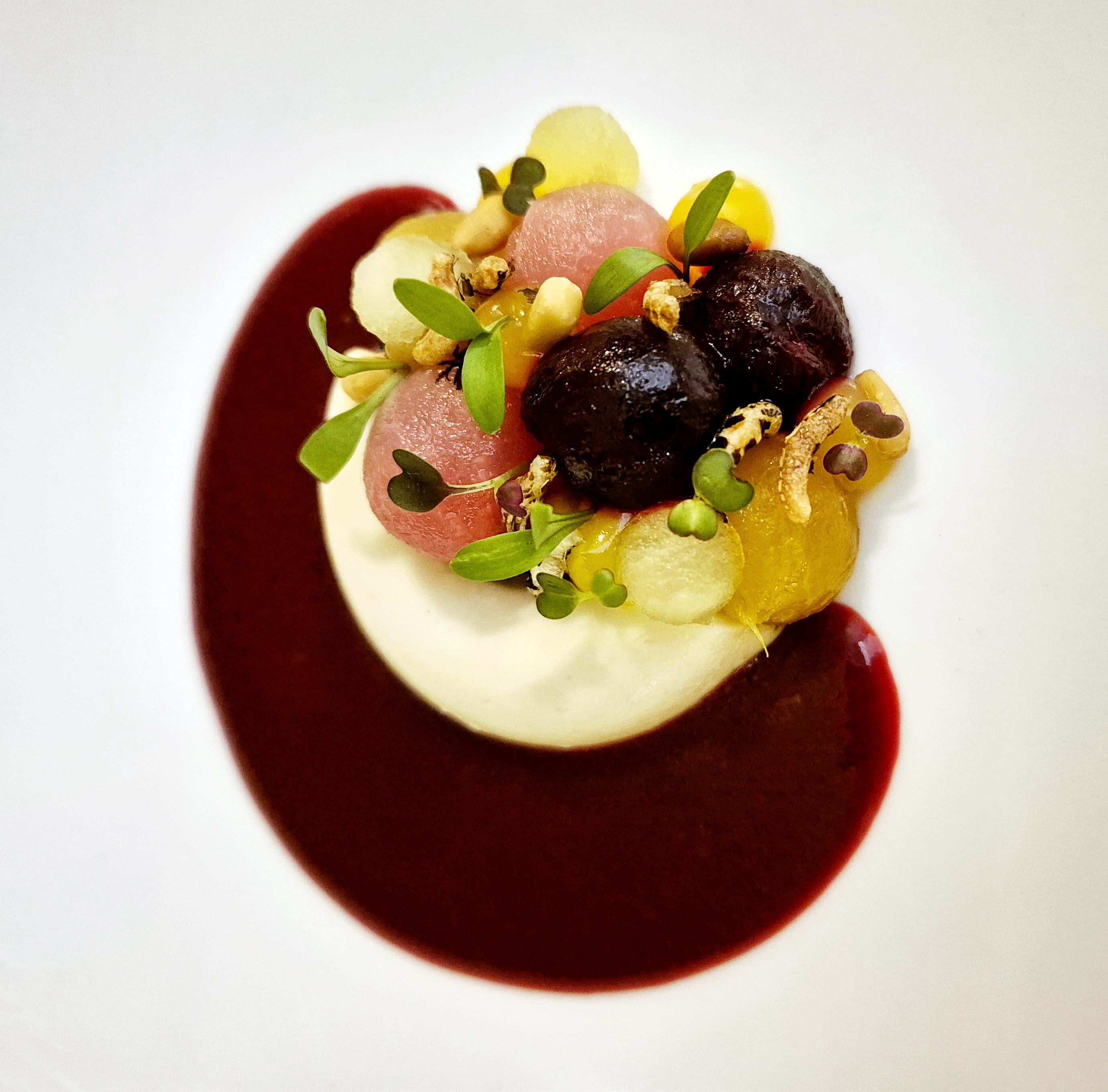 Beetroots – Roasted & pickled garden Beetroots , savoury toasted Coconut bavarois, Beetroot `Rasam`