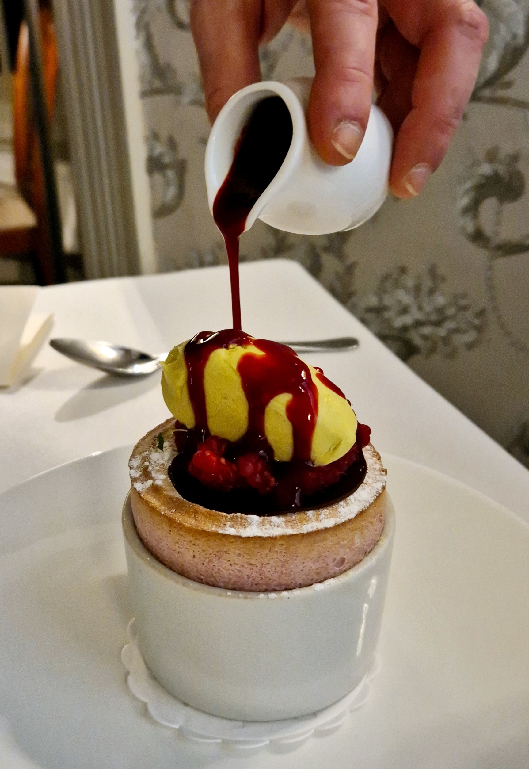 Raspberry & Pistachio Souffle and Toasted Pistachio ice cream.