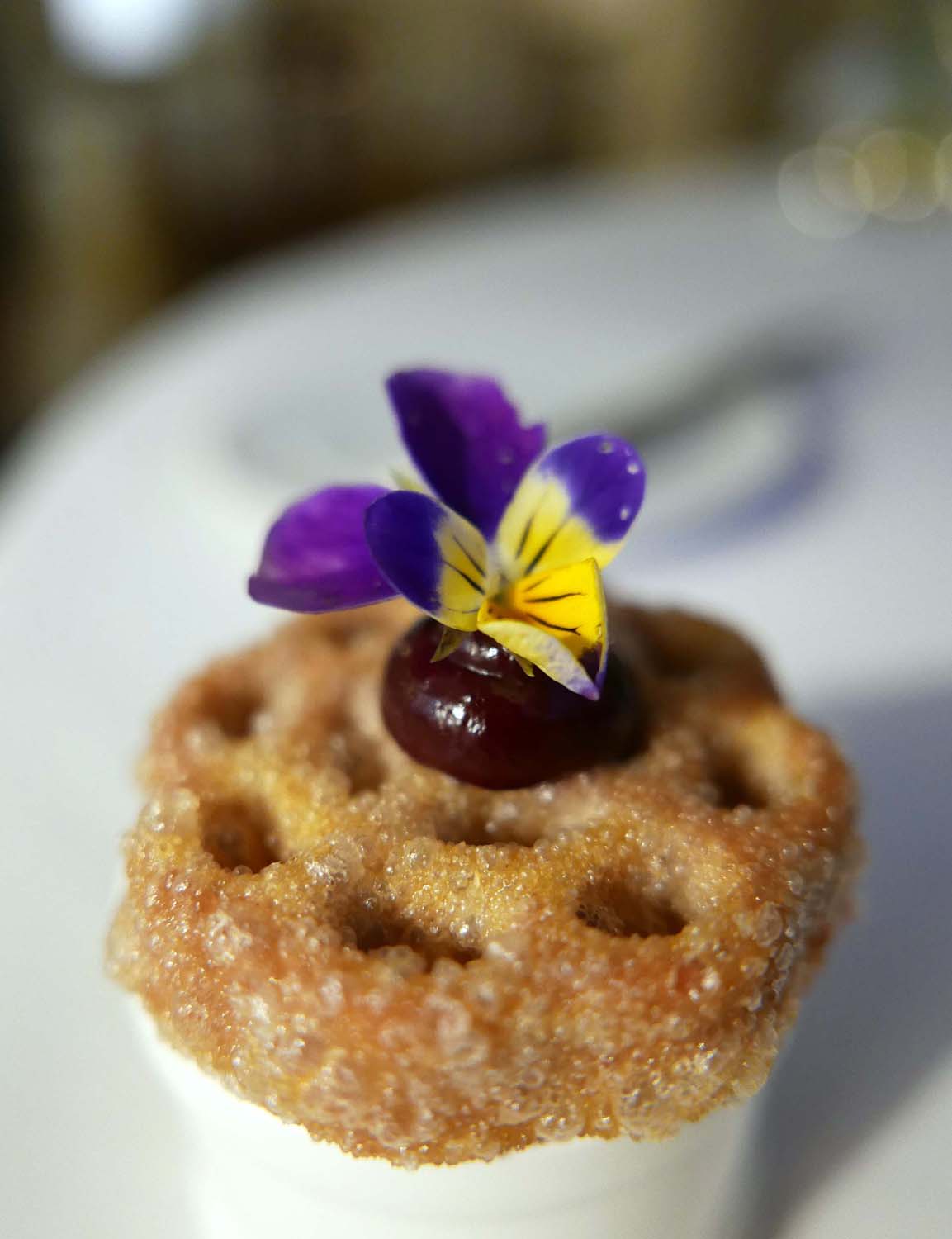 Nibbles at the table – Duck Liver Cookie – Spiced crispy cookie , Duck Liver Parfait , Cherry gel.