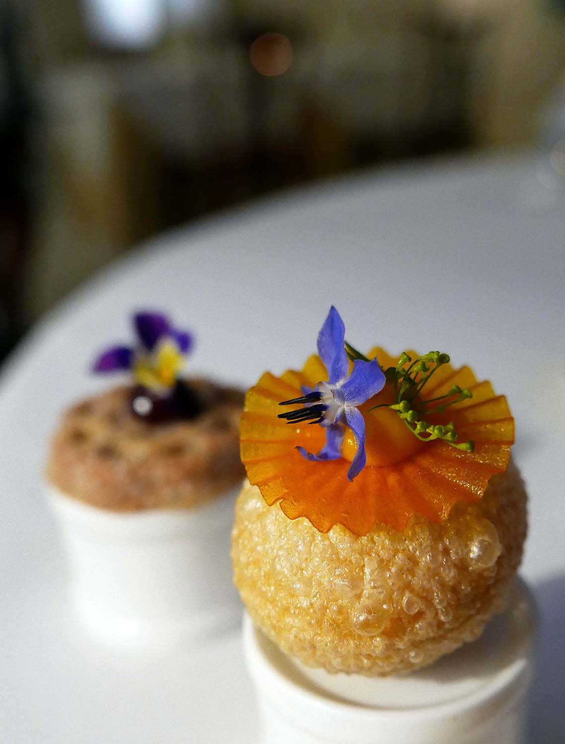 Nibbles at the table – Pani Puri – Garden Carrot , Pine nuts , Thai style Carrot sauce.