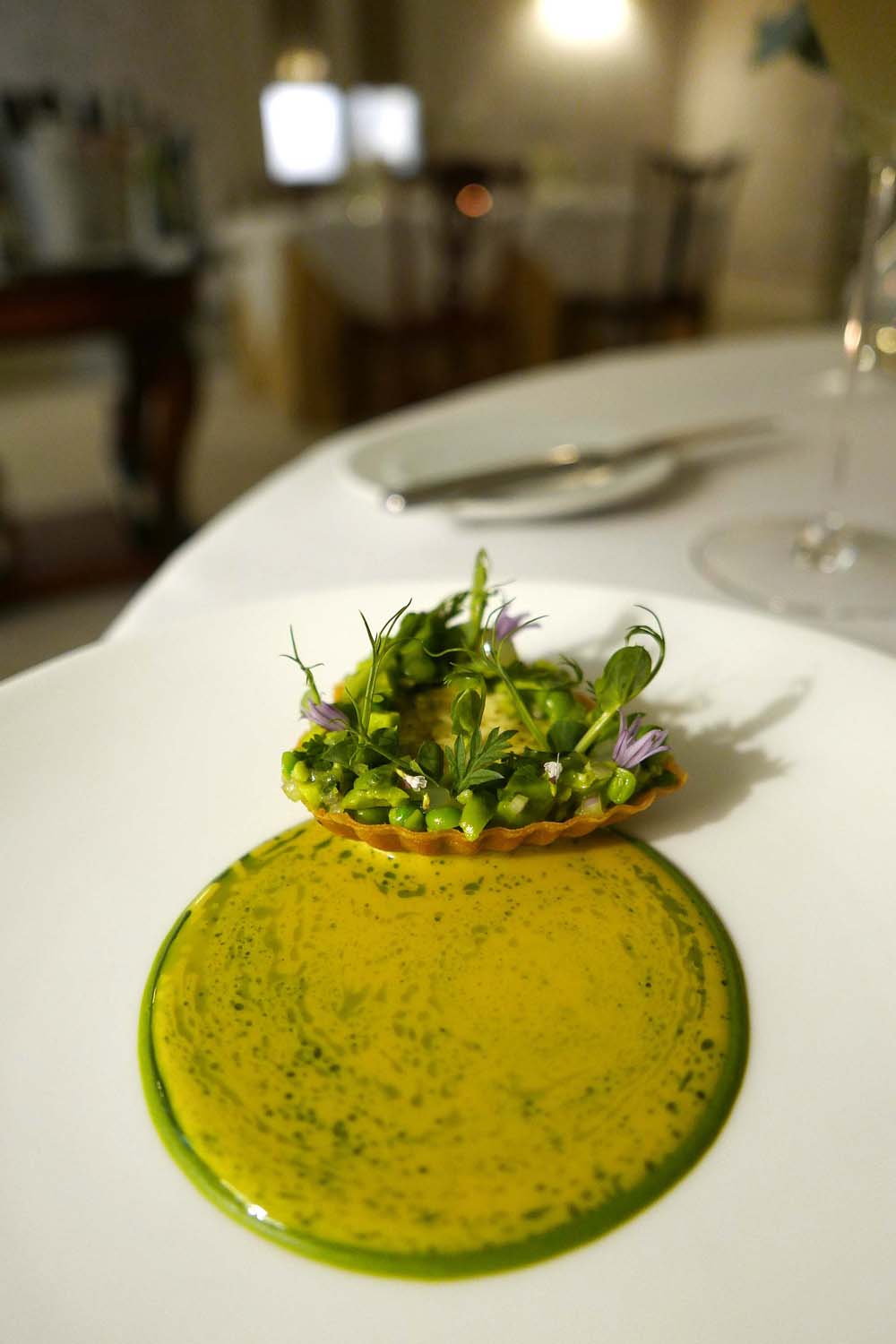 Garden Peas & Broad bean Tart – Aged Parmesan custard , Spring onion & pea puree , Moilee sauce.
