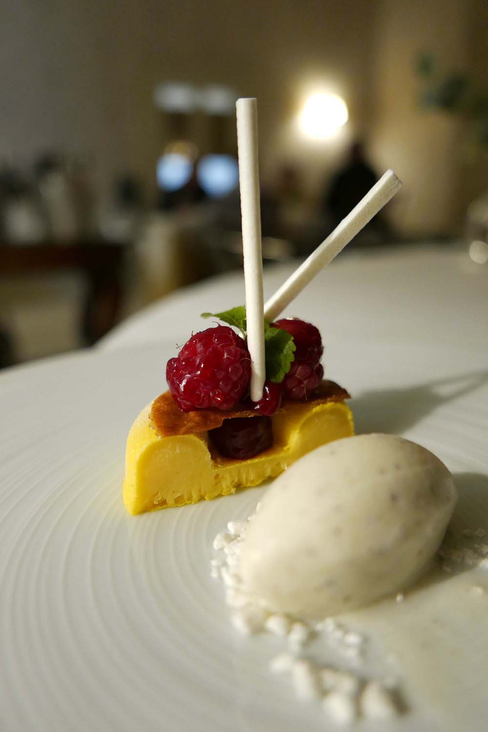 Passion fruit – Baked and frozen passion fruit cream , glazed Raspberries , Meringue , Black pepper & Yoghurt sorbet.
