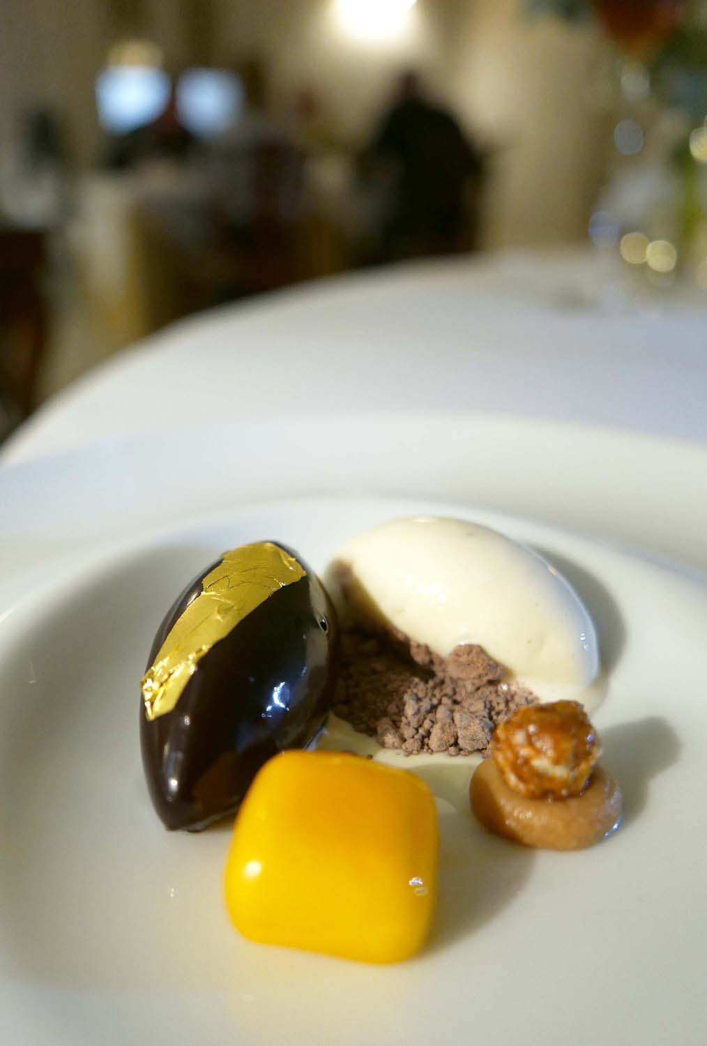 70% Valrhona dark chocolate delice , Banana bread , Caramelised Hazelnut , Milk ice cream.