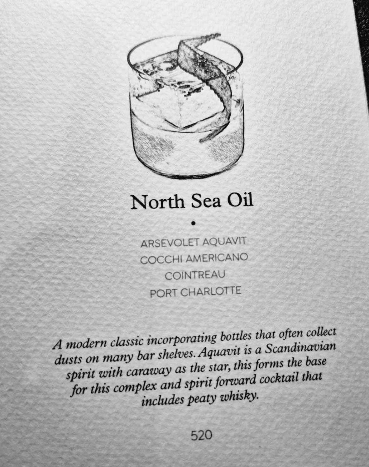 COCKTAIL – “North Sea Oil” (520 baht) – Arvesolvet Aquavit , Cocchi Americano , Cointreau , Port Charlotte. A modern classic cocktail that incorporates bottles that often collect dust on many bar shelves.