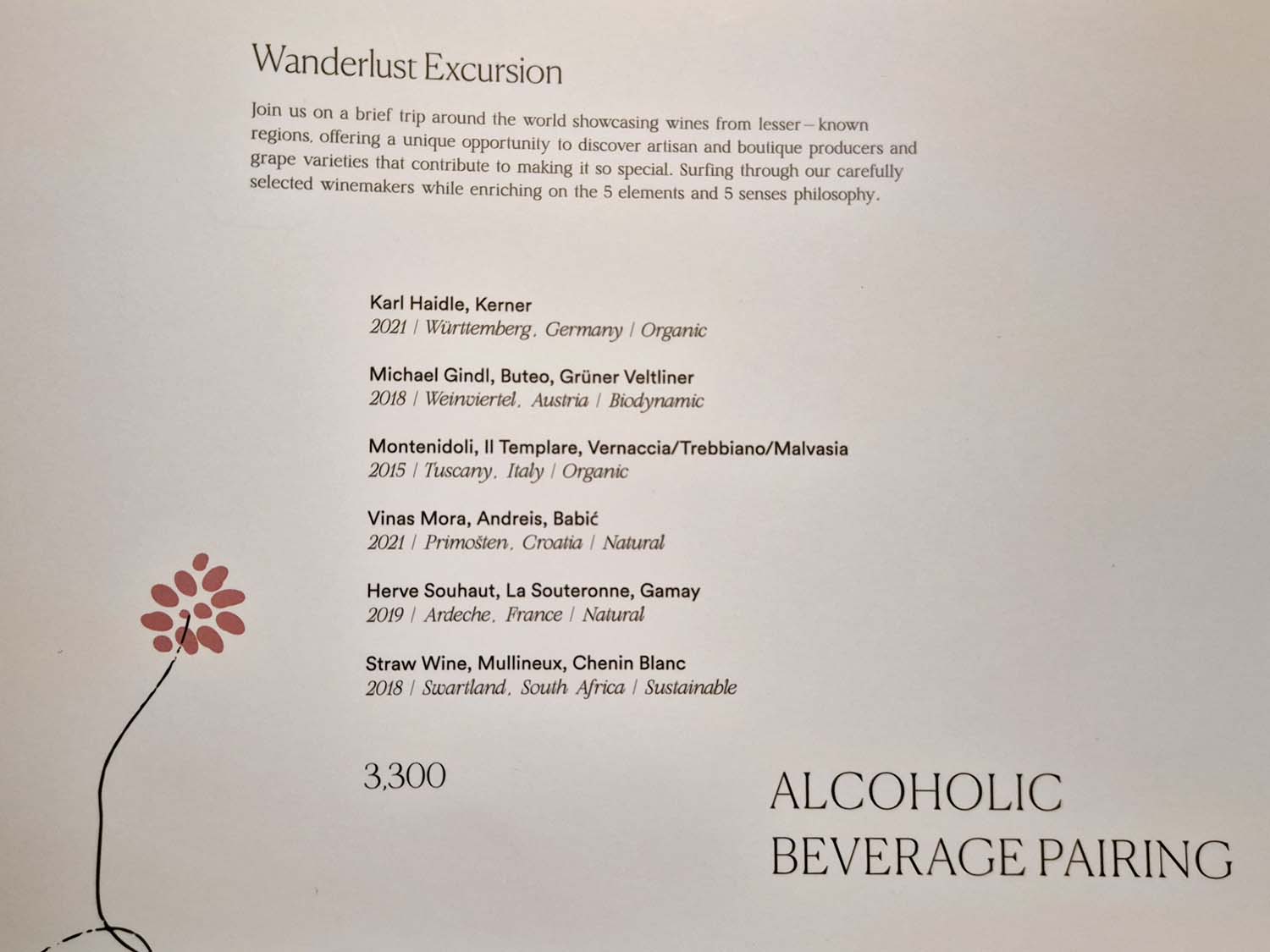 What will it cost me ? Budget on roughly 6,300 Baht per person – (£144 / $187) for the 20 course meal with a complimentary glass of wine. We chose the Wanderlust 6 glass Wine pairing priced at 3,300 (£80 / $104). A non alcoholic Tea Pairing (6 glasses) is also available for 1,390 baht (£32 / $41)