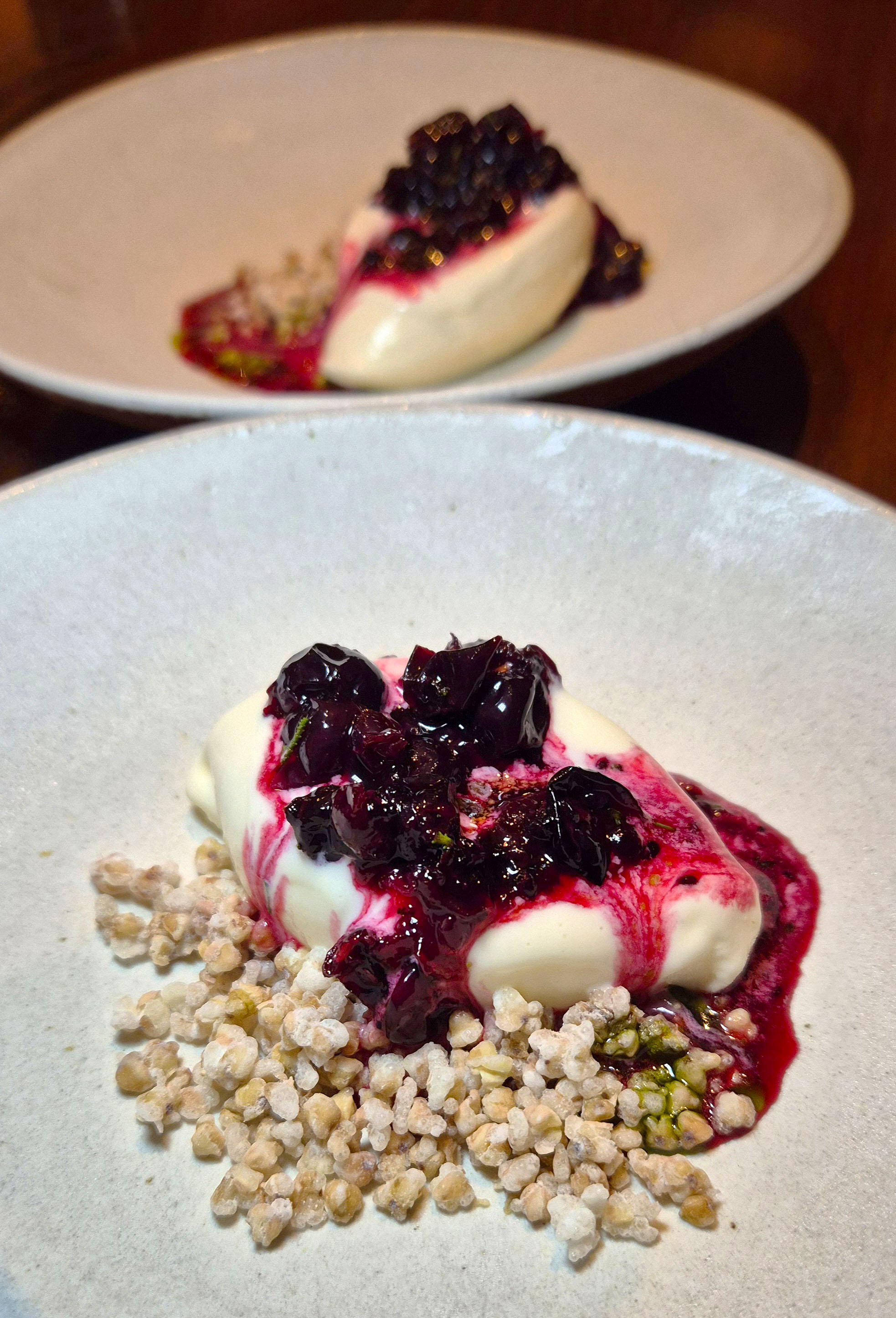 Preserved Blackcurrant , Olive Oil leaf Oil , Koji , Toasted Buckwheat ice cream.